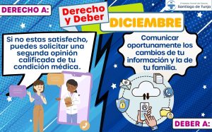 Con el propósito de fortalecer la experiencia de los usuarios y fomentar una atención en salud más transparente y participativa, la ESE Santiago de Tunja continúa desarrollando una estrategia informativa mediante la cual, cada mes, presenta un derecho y un deber fundamental de los usuarios del sistema de salud.
